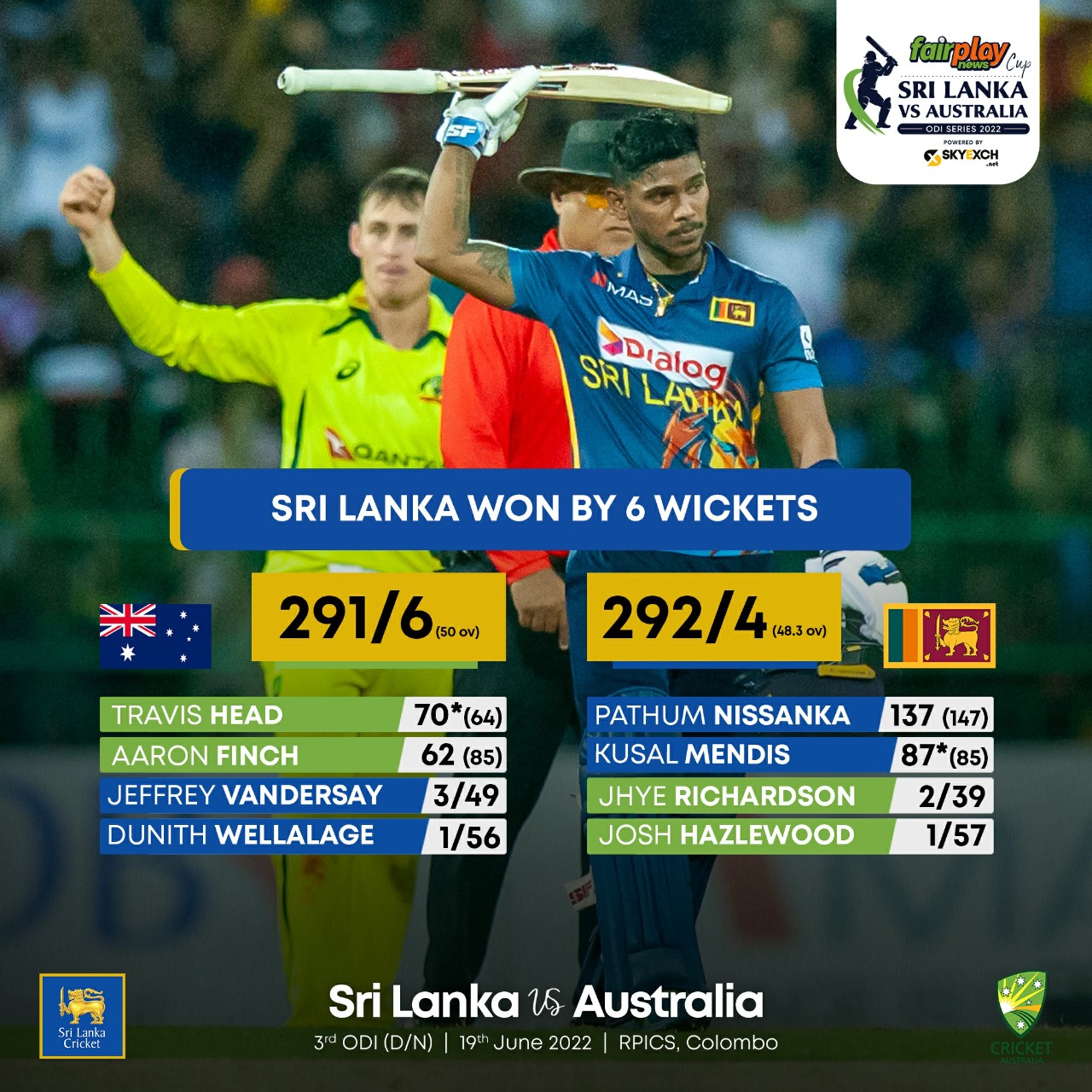 Sri Lanka Cricket On Twitter Pathum Nissanka 137 And Kusal Mendis 87 Led The Charge As Sri Lanka Beat Australia By 6 Wickets Sri Lanka Take A 2 1 Series Lead